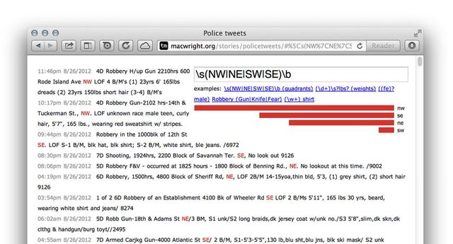 You can see the data on the left, and notice a pattern, and investigate it on your own: a coworker made a query about beards, or you could look at shirt variations. This chooses text as its axis and pivots on that, allowing for both extremely custom cases, like finding mentions of DC's quadrants, but without having a complex data model or really any user-interface.