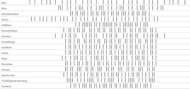 Recently I've added many more options - 16 scales from this ~excellently useful post~. It's interesting to hear which ones work well. As a hack musician myself, I expected the simpler options like a blues pentatonic scale to fare well, since a simple instrument like an appalachian dulcimer tends to use a subset. But in practice, more complex, harmonic and minor scales seem to sound more natural or correct.