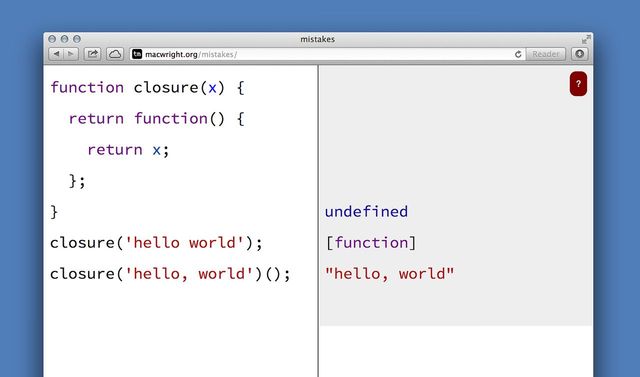 You type JavaScript on the left, and it echoes the results of an expression on the right, per-line. There's not a lot of magic: it works as you'd expect, with eval(), slice(), and so on. The only nitpicky tweak required is to give eval scope, so that loops like for (var i = 0... don't clobber the i variable that mistakes relies on.