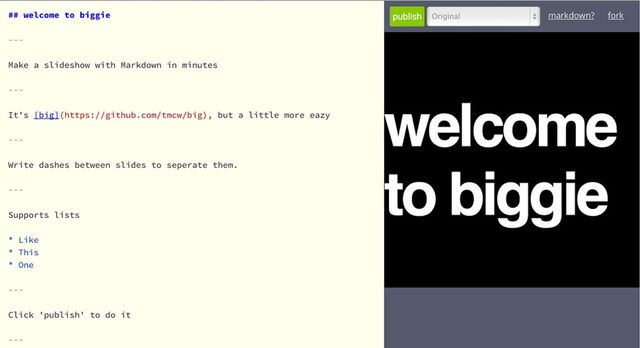 Biggie is a tool for making presentations that makes it easy to make presentations with big, and publish with one click. Unlike Big, Biggie does the trick of turning Markdown into slides, provided you separate slides with ---, the 'hr' shorthand.