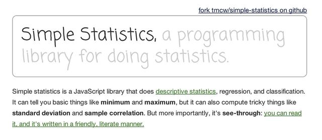 I finally made a website for simple-statistics on Max Ogden's sage advice, and finally realized how much of a problem it is to have a GitHub project as the only landing page for something. While it's a familiar sight for core developers, to the uninitiated, it's over-complex and overfilled with information that's unrelated to just understanding and using a thing.