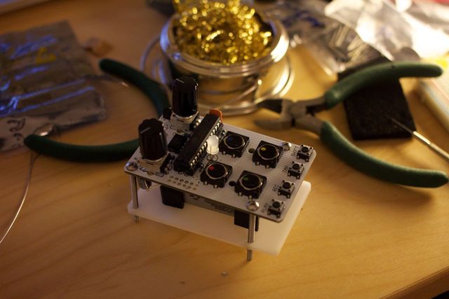 I finally finished building my Bleep Drum. I soldered a capacitor in on the wrong side, extracted it, and then soldered it in on the wrong side again. The final product includes some creative rewiring.