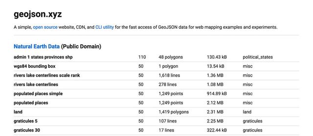 So geojson.xyz was born. Thanks to the diligent and brilliant work of Nathaniel V. Kelso, Natural Earth Data already has the files we need in GeoJSON, with clear licensing and clean data. All that's needed to solve the problem is to filter out the big files