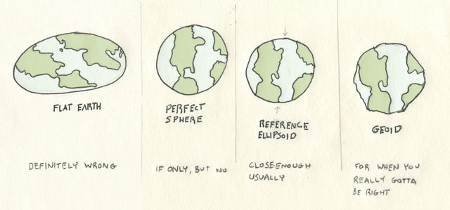 The first sign of trouble is that the earth isn't a sphere. An ellipse is a closer approximation1. So, our system for latitude and longitude uses an ellipse that's 42 kilometers wider than it is tall. The WGS84 standard declares the specifics so everyone's conversions to and from latitude and longitude units match.