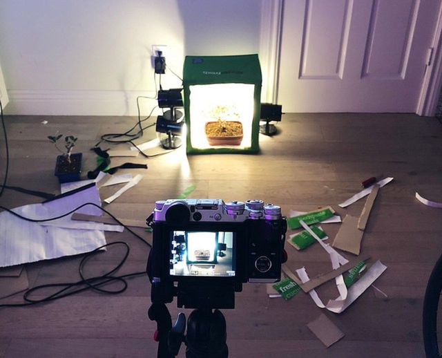 - A hacked-apart AmazonFresh box. When you get stuff from AmazonFresh, they deliver it in this overbuilt box made of foam, poly fabric, and cardboard. I cut through the cardboard and one layer of poly fabric on the left and right sides to get diffuse light through, and then through the front, and cut off the black bottom panel to expose the white poly fabric underneath.